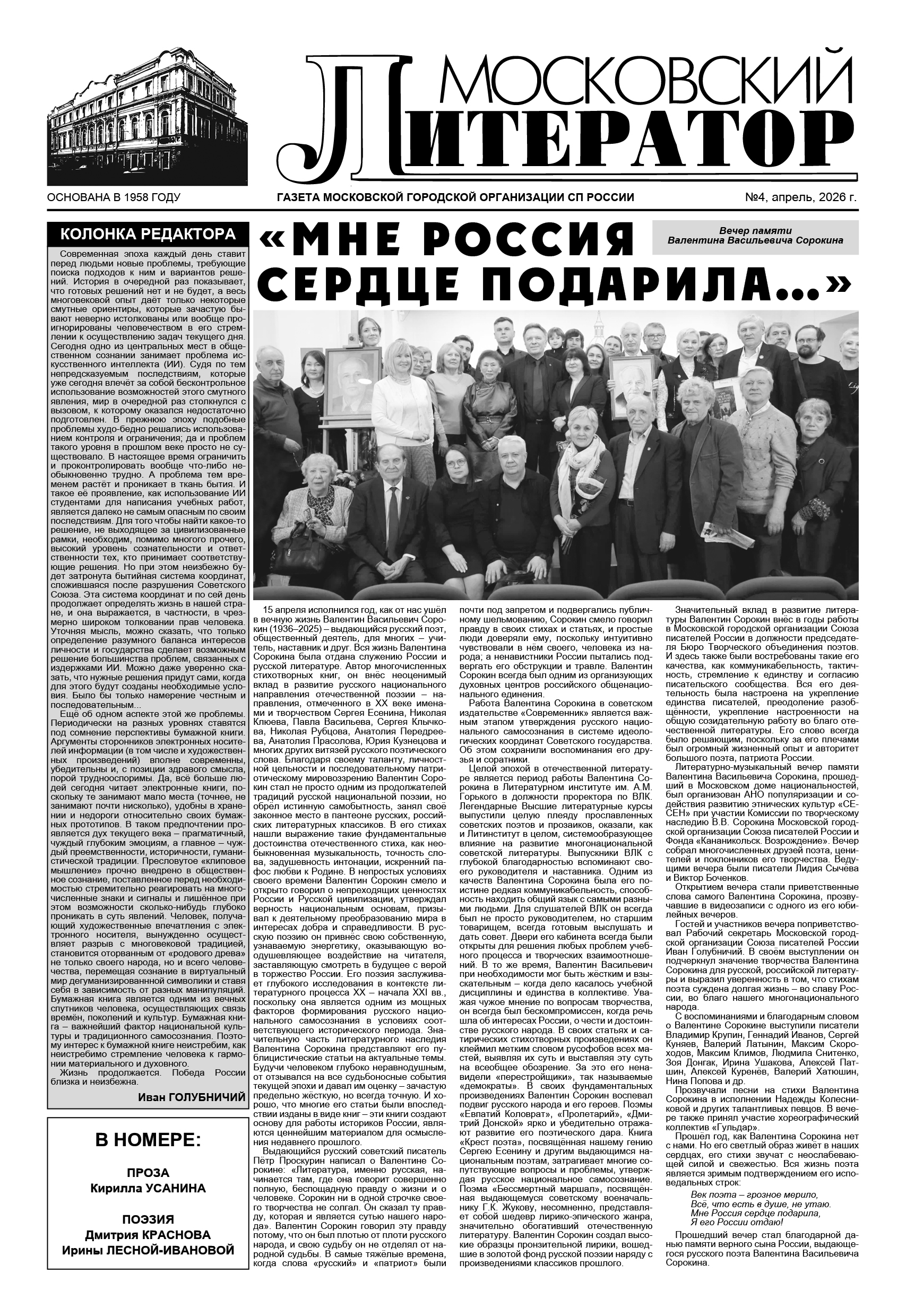 15 апреля исполнился год, как от нас ушёл в вечную жизнь Валентин Васильевич Сорокин (1936–2025) – выдающийся русский поэт, общественный деятель, для многих – учитель, наставник и друг. Вся жизнь Валентина Сорокина была отдана служению России и русской литературе. Автор многочисленных стихотворных книг, он внёс неоценимый вклад в развитие русского национального направления отечественной поэзии – направления, отмеченного в XX веке именами и творчеством Сергея Есенина, Николая Клюева, Павла Васильева, Сергея Клычкова, Николая Рубцова, Анатолия Передреева, Анатолия Прасолова, Юрия Кузнецова и многих других витязей русского поэтического слова. Благодаря своему таланту, личностной цельности и последовательному патриотическому мировоззрению Валентин Сорокин стал не просто одним из продолжателей традиций русской национальной поэзии, но обрёл истинную самобытность, занял своё законное место в пантеоне русских, российских литературных классиков. В его стихах нашли выражение такие фундаментальные достоинства отечественного стиха, как необыкновенная музыкальность, точность слова, задушевность интонации, искренний пафос любви к Родине. В непростых условиях своего времени Валентин Сорокин смело и открыто говорил о непреходящих ценностях России и Русской цивилизации, утверждал верность национальным основам, призывал к деятельному преобразованию мира в интересах добра и справедливости. В русскую поэзию он привнёс свою собственную, узнаваемую энергетику, оказывающую воодушевляющее воздействие на читателя, заставляющую смотреть в будущее с верой в торжество России. Его поэзия заслуживает глубокого исследования в контексте литературного процесса XX – начала XXI вв., поскольку она является одним из мощных факторов формирования русского национального самосознания в условиях соответствующего исторического периода. Значительную часть литературного наследия Валентина Сорокина представляют его публицистические статьи на актуальные темы. Будучи человеком глубоко неравнодушным, от отзывался на все судьбоносные события текущей эпохи и давал им оценку – зачастую предельно жёсткую, но всегда точную. И хорошо, что многие его статьи были впоследствии изданы в виде книг – эти книги создают основу для работы историков России, являются ценнейшим материалом для осмысления недавнего прошлого.